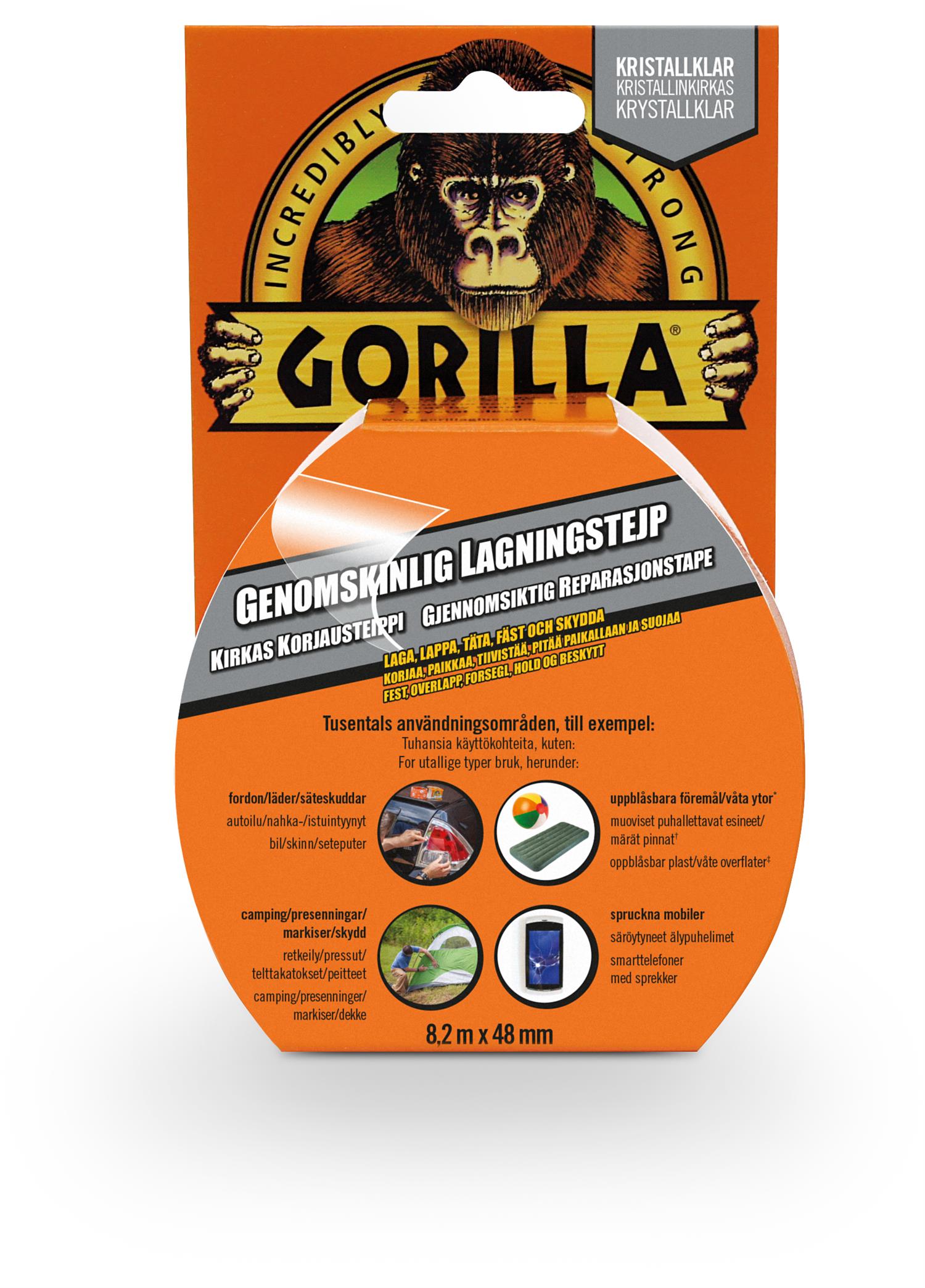 Gorilla Tape Clear Repair 8,2m Krystallklar og meget allsidig tape. Produsent: Gorilla Sku: 24620 kr 185,00 Antall: Kjøp Send til Velg land Norway * Annen * Fraktmetode Navn Estimert leveringsdato Pris Ingen fraktalternativer Bruk Eigendefinert ønskjeliste Ok Legg til i ønskjelista Legg til i samanlikningslista Tips en venn Gorillatape krystallklar er utrolig sterk og perfekt for praktisk tal usynlige reparasjoner. Effektiv i reparasjoner av telt, gummimadrasser og dunjakker. Gulner ikke over tid.Nøkkelegenskaper: Slitesterk overflate. Kan lett rives av for hånd og har et ultrasterkt klebende lag.Du kan tette bassenger, dunjakker, campingutstyr, telefonskjermer mm!Fester også under vann (ikke anbefalt til aquarium), men husk da å få bort alle luftboblene.Temperaturområde: -20ºC til +60ºC.Temperaturområde: -20ºC til +60ºC. Skildring Spesifikasjonar Omtalar Kontakt Oss Gorillatape krystallklar er utrolig sterk og perfekt for praktisk tal usynlige reparasjoner. Effektiv i reparasjoner av telt, gummimadrasser og dunjakker. Gulner ikke over tid.Nøkkelegenskaper: Slitesterk overflate. Kan lett rives av for hånd og har et ultrasterkt klebende lag.Du kan tette bassenger, dunjakker, campingutstyr, telefonskjermer mm!Fester også under vann (ikke anbefalt til aquarium), men husk da å få bort alle luftboblene.Temperaturområde: -20ºC til +60ºC.Temperaturområde: -20ºC til +60ºC. Produktspesifikasjoner Attributtnavn Attributtverdi Butikklager På lager i butikk Produkttype Tilbehøyr friluftsliv