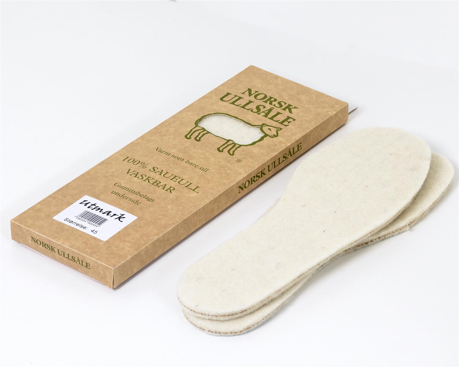 Norsk Ullsåle Utmark er en ekstra tykk innlegg-såle i 100 % ren norsk ull. Tykkelsen er på ca 8mm, det vil si at den egner seg best i støvler, gummistøvler eller annet fottøy som har plass til en ekstra tykk såle. Ullfibrene bindes sammen til en spenstig filt ved hjelp av en nåleteknikk. Saueull er en naturfiber med mange gode egenskaper.